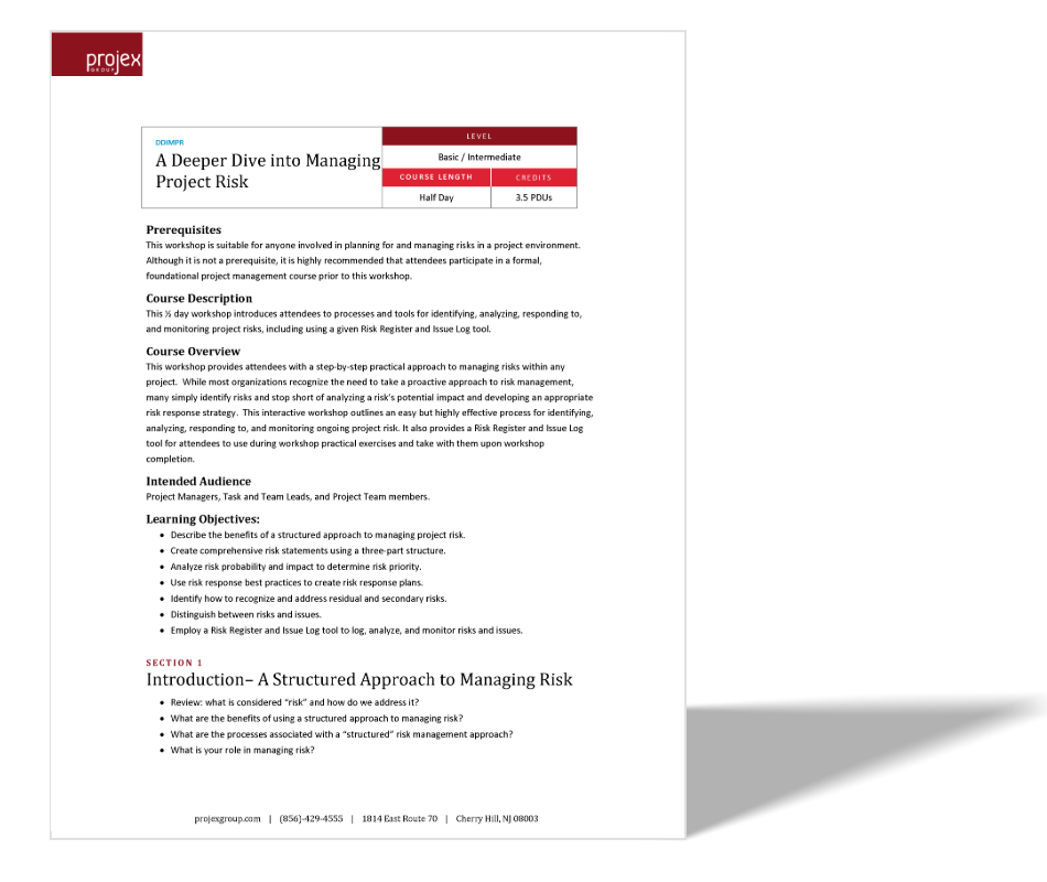 This ½ day workshop introduces attendees to processes and tools for identifying, analyzing, responding to, and monitoring project risks, including using a given Risk Register and Issue Log tool.