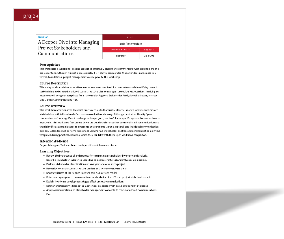 This ½ day workshop introduces attendees to processes and tools for comprehensively identifying project stakeholders and created a tailored communications plan to manage stakeholder expectations. In doing so, attendees will use given templates for a Stakeholder Register, Stakeholder Analysis tool (a Power/Interest Grid), and a Communications Plan.
