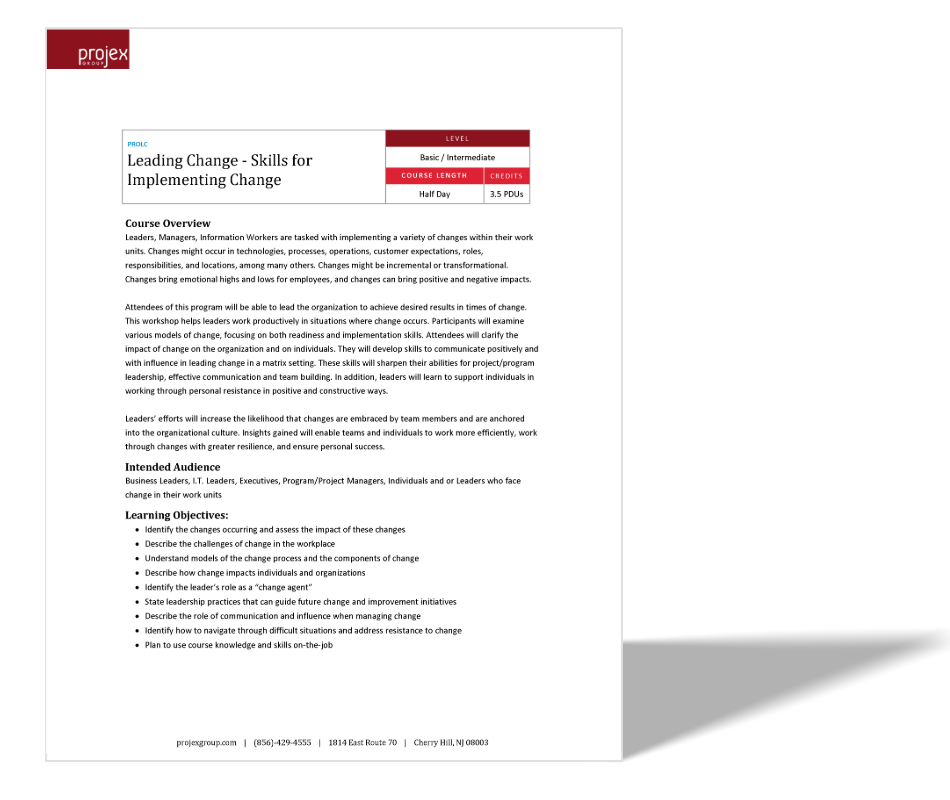 Attendees of this program will be able to lead the organization to achieve desired results in times of change. This workshop helps leaders work productively in situations where change occurs. Participants will examine various models of change, focusing on both readiness and implementation skills. Attendees will clarify the impact of change on the organization and on individuals. They will develop skills to communicate positively and with influence in leading change in a matrix setting. These skills will sharpen their abilities for project/program leadership, effective communication and team building. In addition, leaders will learn to support individuals in working through personal resistance in positive and constructive ways.