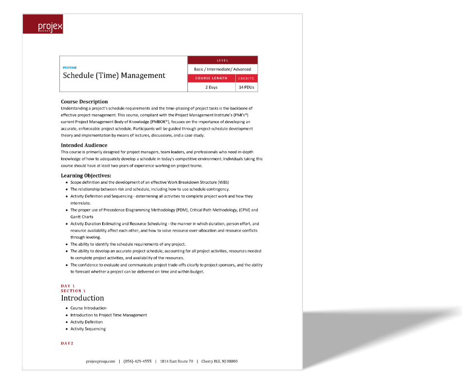 Understanding a project's schedule requirements and the time-phasing of project tasks is the backbone of effective project management. This course, compliant with the Project Management Institute’s (PMI’s®) current Project Management Body of Knowledge (PMBOK®), focuses on the importance of developing an accurate, enforceable project schedule. Participants will be guided through project-schedule development theory and implementation by means of lectures, discussions, and a case study.