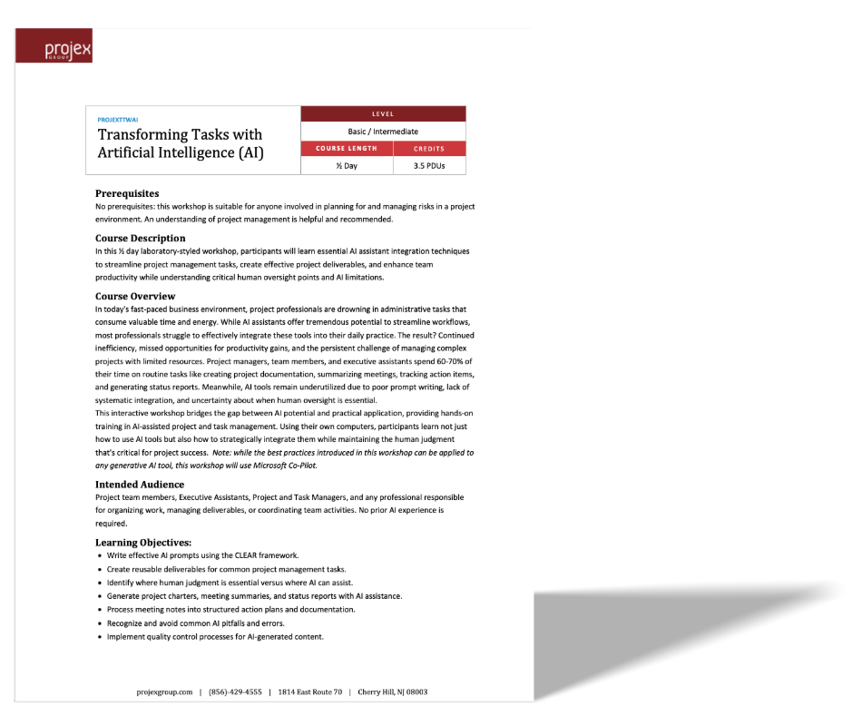 In this ½ day laboratory-styled workshop, participants will learn essential AI assistant integration techniques to streamline project management tasks, create effective project deliverables, and enhance team productivity while understanding critical human oversight points and AI limitations.